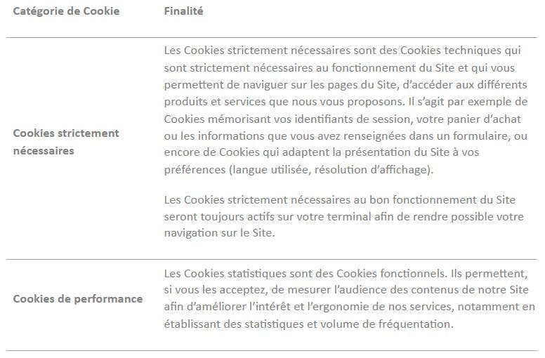 Les Cookies qui sont déposés sur le Site sont de plusieurs types. Ils peuvent être déposés par nous ou par des tiers autorisés et répondent chacun à des finalités différentes :